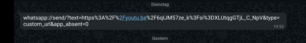 Solche Deep Links sind für gewöhnlich harmlos. Sie dienen dazu, beim Öffnen direkt eine Nachricht in WhatsApp bzw. der gewünschten Ziel-App vorzubereiten – in diesem Fall mit der eigentlichen YouTube-URL. Doch diesmal lief etwas schief: Der Deep Link selbst wurde nicht ausgeführt, sondern als reiner Text in die Chatnachricht eingefügt.